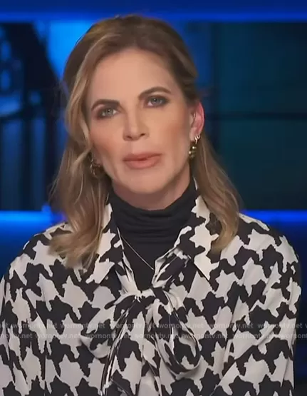 on Access Hollywood on NBC was spotted wearing this Natalie Morales’ houndstooth print tie neck blouse on Access Hollywood on Mar 04 2024's episode. 's Top is the Leuca Hounds-Tooth Shirt by Luisa Spagnoli.