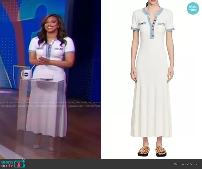 Morgan Norwood on Good Morning America on ABC was spotted wearing this white contrast denim trim dress on Good Morning America on Mar 06 2024's episode. Morgan's Dress is the Alecia Short Sleeve Sweater Dress by Sandro.