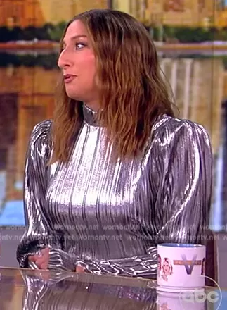 on The View on ABC was spotted wearing this silver sequin top and patterned skirt on The View on Mar 06 2024's episode. 's Top is the Metallic Plisse Top by Selected Femme . 's Skirt is the Diamond Sequin Skirt by Lisou.