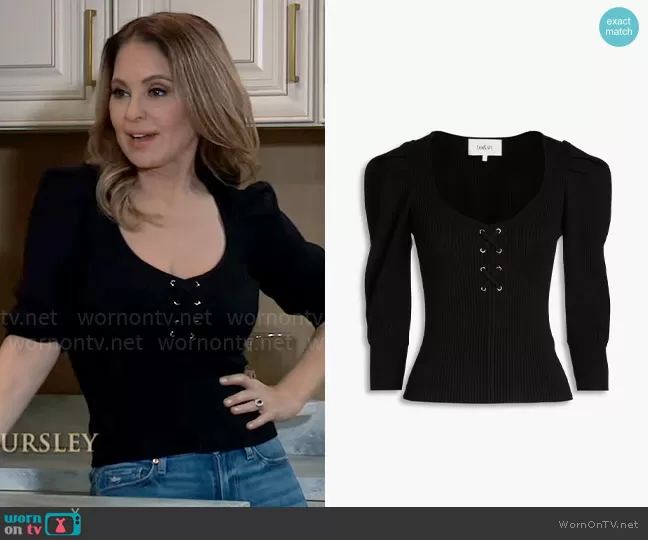 Olivia Falconeri (played by Lisa Lo Cicero) on General Hospital on ABC was spotted wearing this black lace-up top on General Hospital on Mar 06 2024's episode. Olivia's Top is the Boby Sweater by ba&sh.