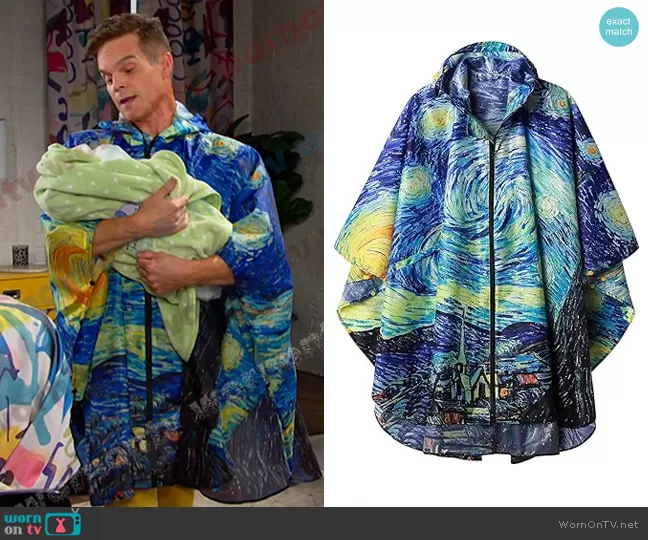 Leo Stark (played by Greg Rikaart) on Days of our Lives on Peacock was spotted wearing this van Gogh Starry Night print poncho on Days of our Lives on Mar 07 2024's episode. Leo's Jacket is the Unisex Hooded Raincoat Poncho in Van Gogh the Starry Night by SaphiRose.