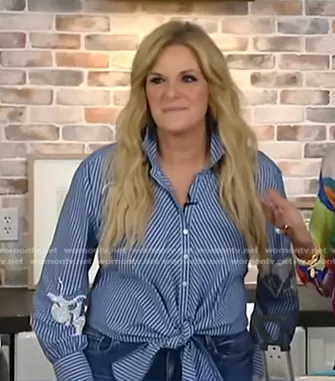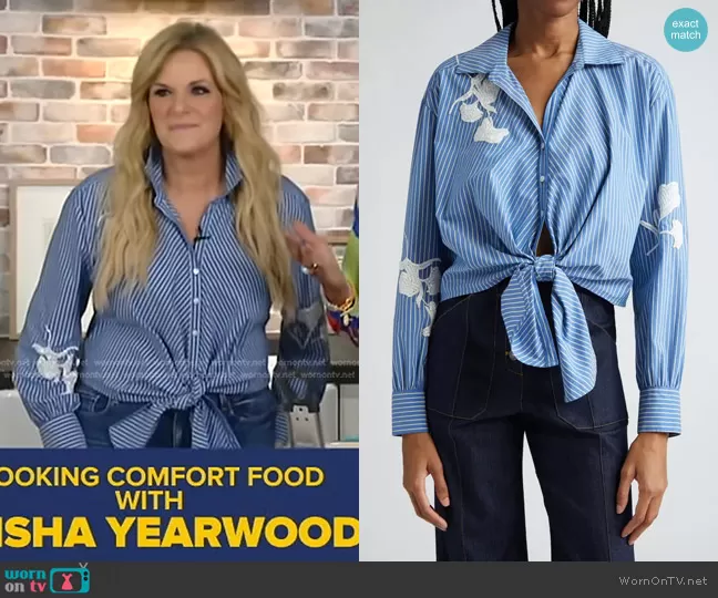 on Good Morning America on ABC was spotted wearing this blue striped tie front shirt on Good Morning America on Mar 07 2024's episode. 's Top is the Lya Beaded Floral Stripe Cotton Blend Shirt in Oxford Blue by Cinq a Sept.