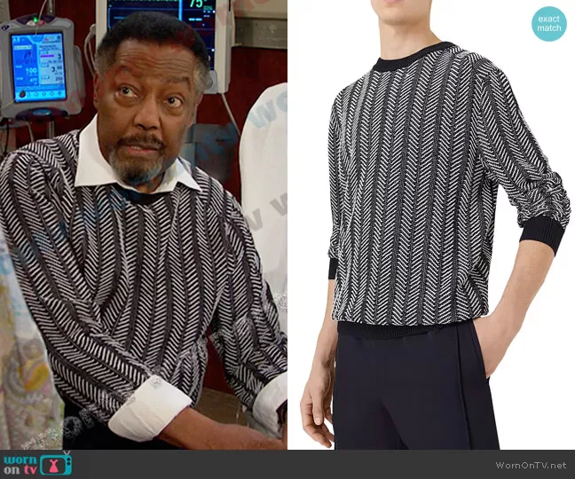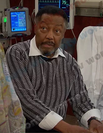 Abe Carver (played by James Reynolds) on Days of our Lives on Peacock was spotted wearing this black chevron sweater on Days of our Lives on Mar 08 2024's episode. 's Sweater is the Striped Crewneck Sweater by Emporio Armani.