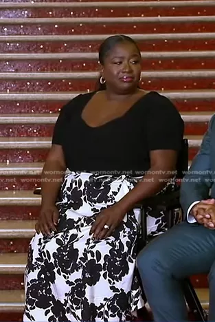 on Good Morning America on ABC was spotted wearing this black and white floral dress on Good Morning America on Mar 08 2024's episode. 's Dress is the Josephina Belted Cotton Poplin & Rib-Knit Midi-Dress by Tanya Taylor.