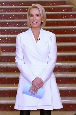 Dr. Jennifer Ashton on Good Morning America on ABC was spotted wearing this white blazer dress on Good Morning America on Mar 08 2024's episode. Jennifer's Dress is the Layered Wool-Silk Mini Blazer Dress by Brandon Maxwell.
