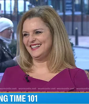 on Today on NBC was spotted wearing this purple folded neck dress on Today on Mar 08 2024's episode. 's Dress is the 3/4-Sleeve Belted Tulip Dress by Calvin Klein.