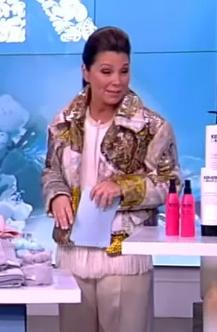 on The View on ABC was spotted wearing this metallic jacquard jacket on The View on Mar 11 2024's episode. 's Jacket is the Vondi Patchwork Brocade Jacket by Dries Van Noten.
