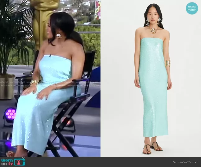 on Good Morning America on ABC was spotted wearing this blue sequin strapless dress on Good Morning America on Mar 11 2024's episode. 's Dress is the Strapless Sequin Column Gown by Tory Burch.
