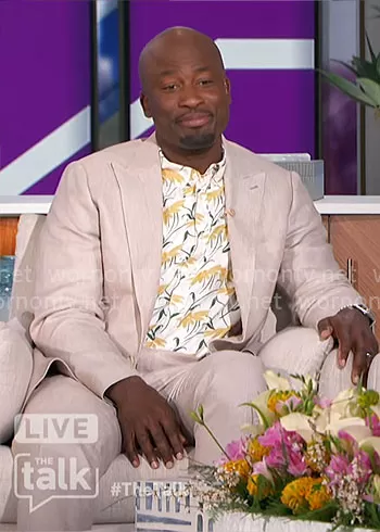 Akbar Gbajabiamila on The Talk on CBS was spotted wearing this yellow floral print shirt on The Talk on Mar 11 2024's episode. Akbar's Shirt is the Short-sleeve stretch Secret Wash cotton poplin shirt in daisy print by J. Crew . Akbar's Shoes is the Air Jordan 1 Mid SE Taupe Haze sneakers by Nike.