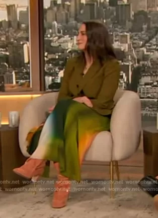 on The Drew Barrymore Show on CBS was spotted wearing this tie dye pleated skirt on The Drew Barrymore Show on Mar 11 2024's episode. 's Skirt is the Cambrie Skirt by Marie Oliver.