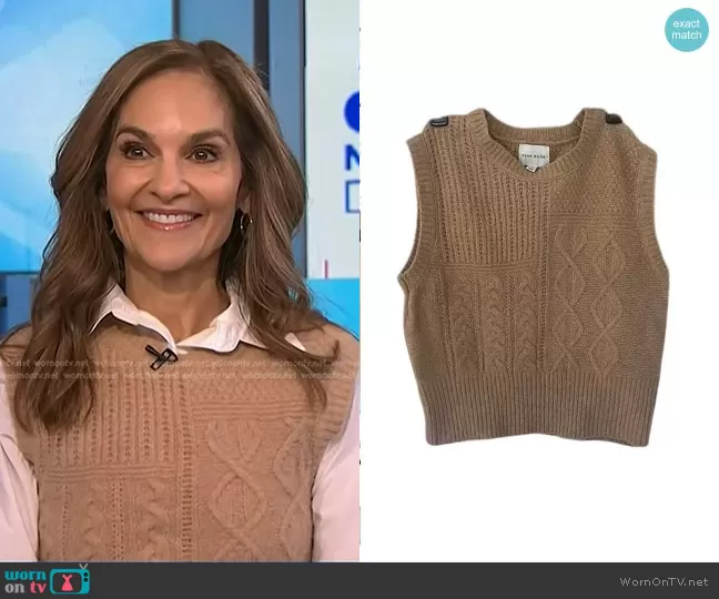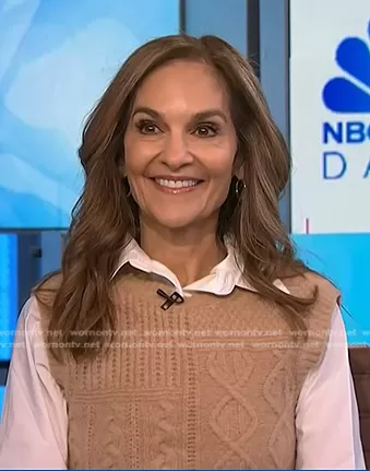 on NBC News Daily on NBC was spotted wearing this beige cable knit vest on NBC News Daily on Mar 22 2024's episode. 's Sweater is the Cable Knit Sweater Vest by Pink Rose.