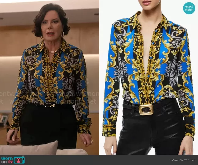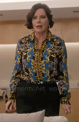 Margaret Wright (played by Marcia Gay Harden) on So Help Me Todd on CBS was spotted wearing this blue and gold flourish print blouse on So Help Me Todd on episode 'Dial Margaret for Murder' (2x04) in Mar 2024. Margaret's Top is the Willa Shirt in Regal Romance Sapphire by Alice + Olivia.