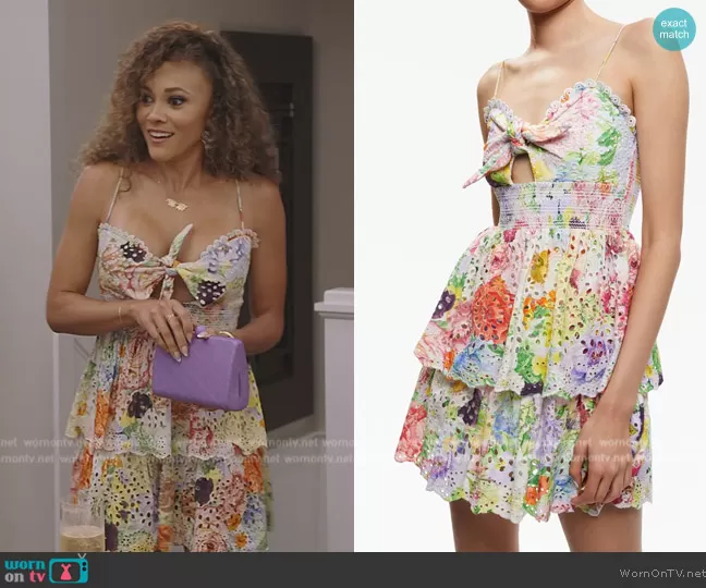 Ashley Darby on The Real Housewives of Potomac on Bravo was spotted wearing this floral print eyelet mini dress on The Real Housewives of Potomac on episode 'Boiling Point' (8x16) in Mar 2024. Ashley's Dress is the Fina Floral Ruffle Cotton Minidress by Alice + Olivia.