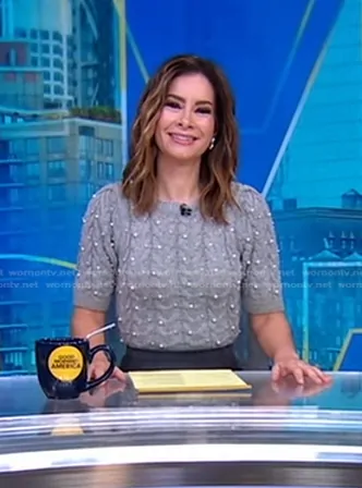 Rebecca Jarvis on Good Morning America on ABC was spotted wearing this grey pearl embellished sweater on Good Morning America on Dec 16 2025's episode. Rebecca's Sweater is the Knit Sweater with Pearls in Light Gray by Zara.