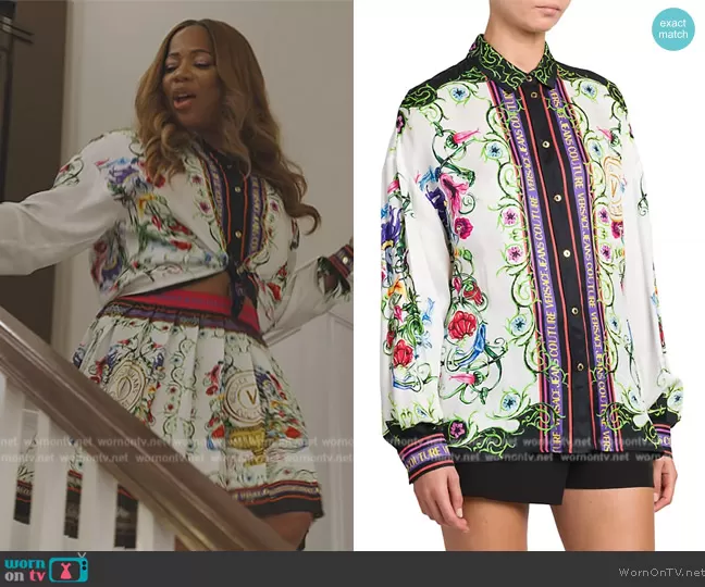 Charrisse Jackson Jordan on The Real Housewives of Potomac on Bravo was spotted wearing this floral print top and skirt on The Real Housewives of Potomac on episode 'Boiling Point' (8x16) in Mar 2024. 's Top is the Garden Baroque Print Shirt by Versace . 's Skirt is the V-Emblem Garden miniskirt by Versace.