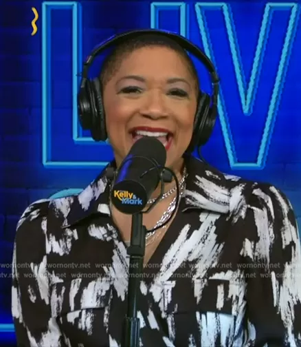 Deja Vu on Live with Kelly and Mark on Disney ABC Home Entertainment was spotted wearing this black abstract print dress on Live with Kelly and Mark on Mar 12 2024's episode. Deja Vu's Dress is the Printed Belted Dress by DKNY.