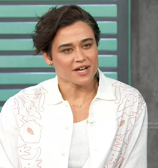 on Access Hollywood on NBC was spotted wearing this white floral embroidered shirt and pants on Access Hollywood on Mar 12 2024's episode. 's Top is the Graphic-print long-sleeve Shirt by Bode . 's Pants is the Bombora Couching Embroidered Wool Blend Wide Leg Trousers by Bode.