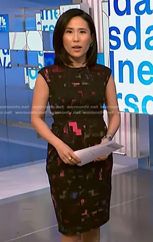 Vicky Nguyen on NBC News Daily on NBC was spotted wearing this printed cap sleeve sheath dress on NBC News Daily on Mar 12 2024's episode. Vicky's Dress is the Sueded Trim Ponte Knit Sheath Dress by Maggy London .