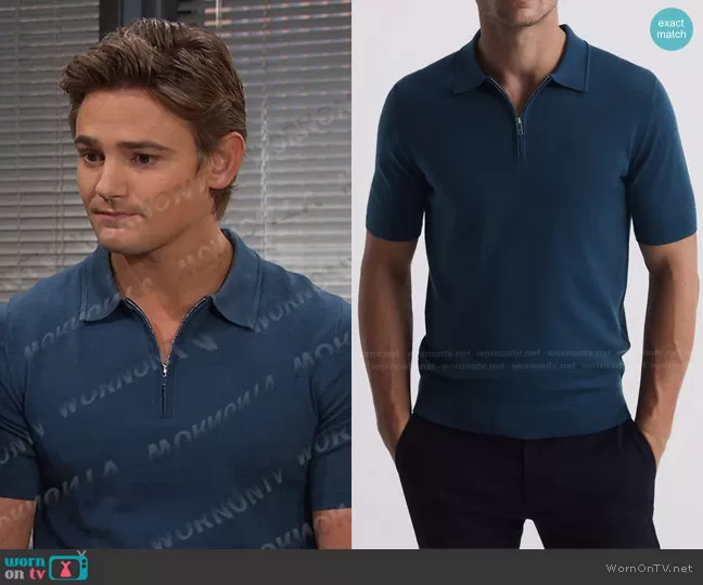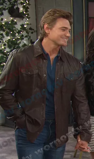 Johnny DiMera (played by Carson Boatman) on Days of our Lives on Peacock was spotted wearing this blue polo shirt and brown leather shirt jacket on Days of our Lives on Mar 13 2024's episode. Johnny's Shirt is the Maxwell Short Sleeve Merino Zip Polo Shirt in Airforce by Reiss . Johnny's Jacket is the Napa Leather Shirt Jacket by John Varvatos.