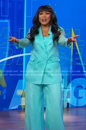 on Good Morning America on ABC was spotted wearing this blue organza blazer and pants on Good Morning America on Mar 13 2024's episode. 's Jacket is the Negrar Silk Organza Double Breast Jacket in Water by Max Mara . 's Pants is the Calibri Silk Organza Wide Pants in Water by Max Mara.