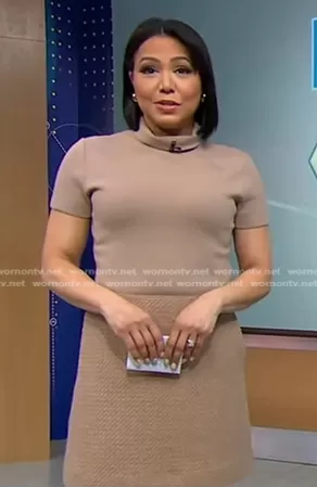 Stephanie Ramos on Good Morning America on ABC was spotted wearing this beige mixed media dress on Good Morning America on Mar 13 2024's episode. Stephanie's Dress is the Tweed & Knit Turtleneck Minidress in Palomino by Theory.
