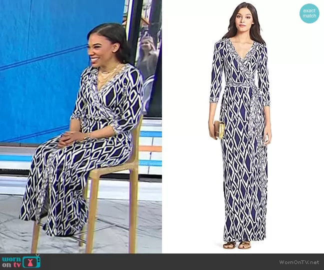 on Today on NBC was spotted wearing this navy geometric print dress on Today on Mar 13 2024's episode. 's Dress is the Julian Wrap Maxi Dress by Diane von Furstenberg.