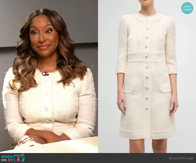 on Today on NBC was spotted wearing this white button front tweed dress on Today on Mar 13 2024's episode. 's Dress is the Button-Front 3/4-Sleeve Tweed Dress by Dolce & Gabbana.