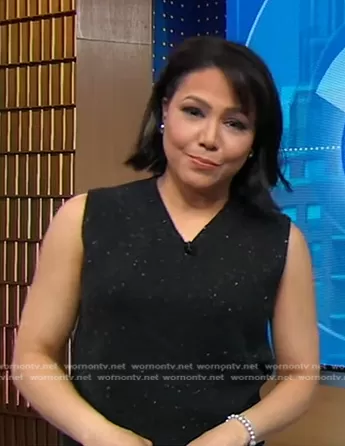 Stephanie Ramos on Good Morning America on ABC was spotted wearing this black speckled knit vest on Good Morning America on Mar 14 2024's episode. Stephanie's Sweater is the Shrunken Wool-Blend Sweater Vest in Charcoal Multi by Theory.