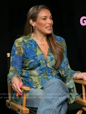 Emily Orozco on Access Hollywood on NBC was spotted wearing this blue floral print ruffle blouse on Access Hollywood on Mar 14 2024's episode. Emily's Top is the Alisha Top by Ronny Kobo.