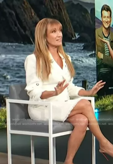 on Access Hollywood on NBC was spotted wearing this white tweed embellished blazer dress on Access Hollywood on Mar 15 2024's episode. 's Dress is the Joel Charm Detail Bouclé Blazer Minidress by Cinq a Sept.