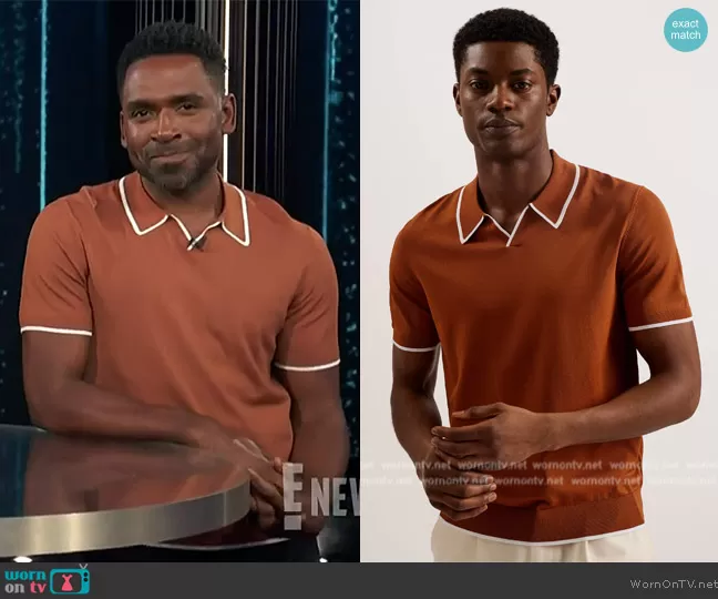 Justin Sylvester on E! News on E! was spotted wearing this orange contrast tipped polo on E! News on Mar 15 2024's episode. Justin's Shirt is the Stortfo Rayon Open Neck Polo by Ted Baker.