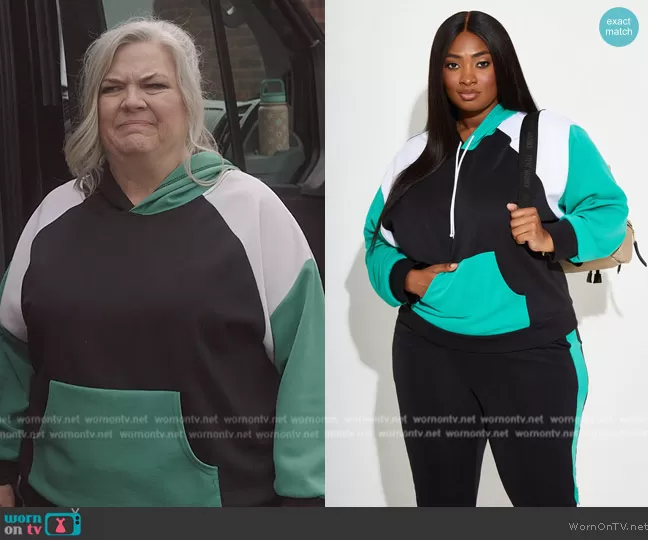 Gloria McManus (played by Paula Pell) on Girls5eva on Peacock was spotted wearing this colorblock jacket and sweatpants on Girls5eva on episode 'Clarksville' (3x03) in Mar 2024. Gloria's Sweater is the Colorblock Stretch Knit Hoodie by Ashley Stewart . Gloria's Pants is the Colorblock Joggers by Ashley Stewart.
