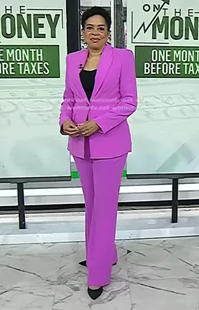 on Today on NBC was spotted wearing this pink blazer and flare pants on Today on Mar 15 2024's episode. 's Jacket is the Single Button Blazer in Peony by Elie Tahari . 's Pants is the Fit & Flare Pants in Peony by Elie Tahari.