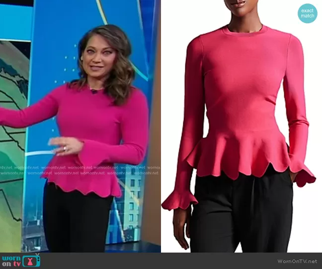 Ginger Zee on Good Morning America on ABC was spotted wearing this pink peplum top on Good Morning America on Mar 18 2024's episode. Ginger's Top is the Lillyyy Long Sleeve Peplum Top in Bright Pink by Ted Baker.