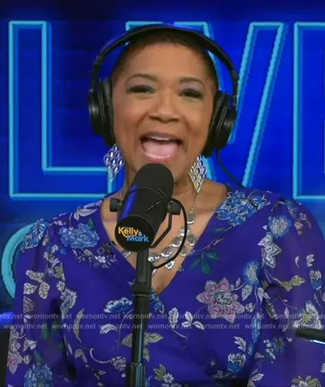 Deja Vu on Live with Kelly and Mark on Disney ABC Home Entertainment was spotted wearing this blue floral print wrap dress on Live with Kelly and Mark on Mar 18 2024's episode. Deja Vu's Dress is the V-Neck Handkerchief-Hem Dress by Jessica Howard.