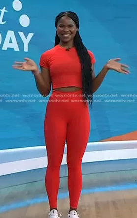 on Today on NBC was spotted wearing this red cropped tee and leggings on Today on Mar 18 2024's episode. 's Top is the Swiftly Tech Cropped Short-Sleeve Shirt 2.0 in Hot Heat by Lululemon . 's Leggings is the Wunder Train High-Rise Tight 28" in Hot Heat by Lululemon.