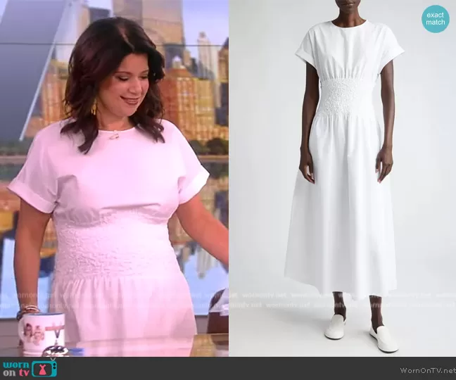 Ana Navarro on The View on ABC was spotted wearing this white smocked dress on The View on Mar 18 2024's episode. Ana's Dress is the Smocked Waist Cotton Poplin Midi Dress by Lafayette 148.