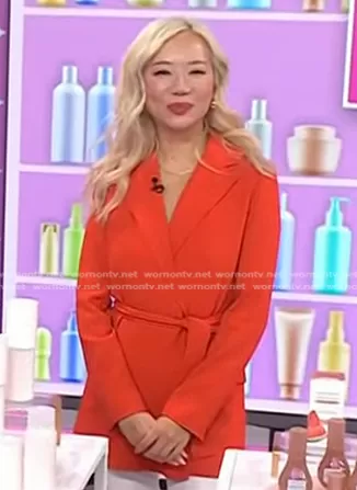 on Today on NBC was spotted wearing this red belted wrap blazer on Today on Mar 19 2024's episode. 's Jacket is the Belted Blazer in Orange by Theory.