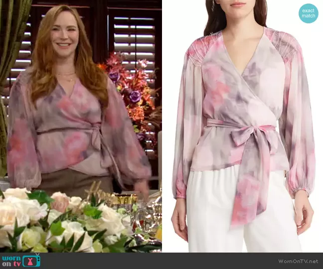 Cassie (played by Camryn Grimes) on The Young and the Restless on CBS was spotted wearing this pink tie dye wrap blouse on The Young and the Restless on Mar 20 2024's episode. 's Top is the Emiliah Wrap Blouse by Ted Baker .