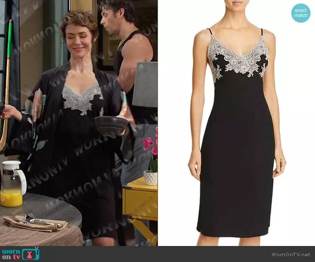 Sarah Horton (played by Linsey Godfrey) on Days of our Lives on Peacock was spotted wearing this black lace trim chemise and floral robe on Days of our Lives on Mar 20 2024's episode. Sarah's Chemise is the Luxe Shangri-La Chemise by Natori . Sarah's Robe is the Aimi Kimono Robe by Kim + Ono.