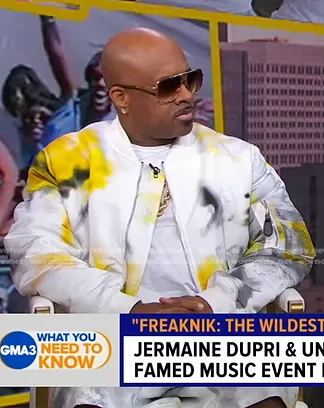 on Good Morning America on ABC was spotted wearing this white tie dye bomber jacket and shorts on Good Morning America on Mar 19 2024's episode. 's Jacket is the Obscured Flower Padded Bomber Jacket by Alexander McQueen . 's Shorts is the Obscured Flower Bermuda Shorts by Alexander McQueen.