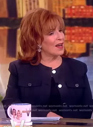 Joy Behar on The View on ABC was spotted wearing this navy button jacket on The View on Mar 20 2024's episode. Joy's Jacket is the Wool-Blend Collarless Jacket by Theory.