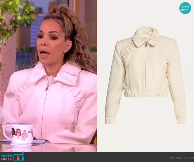 Sunny Hostin on The View on ABC was spotted wearing this ruffle collar jacket on The View on Mar 20 2024's episode. Sunny's Jacket is the Ruched High-Neck Jacket by AnOnlyChild.