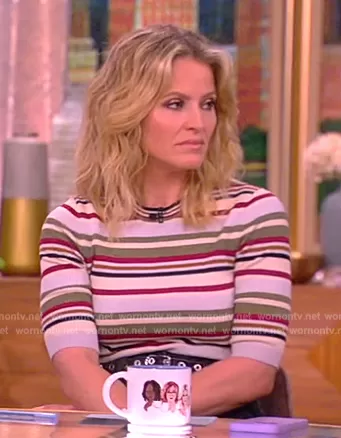 Sara Haines on The View on ABC was spotted wearing this stripe ribbed top on The View on Mar 20 2024's episode. Sara's Sweater is the Kavya striped ribbed-knit sweater by Veronica Beard . Sara's Skirt is the Denim A Line Midi Skirt by 3.1 Phillip Lim.