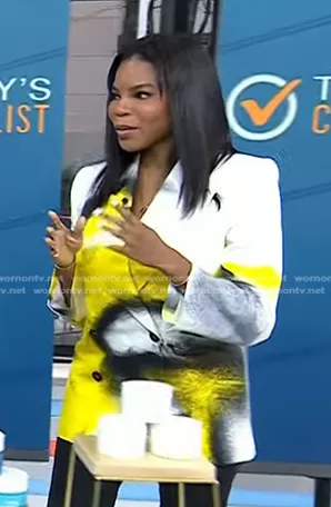 on Today on NBC was spotted wearing this white and yellow print blazer on Today on Mar 20 2024's episode. 's Jacket is the Mushroom-Spores Double-Breasted Jacket by Alexander McQueen.