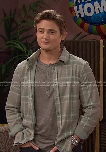 Johnny DiMera (played by Carson Boatman) on Days of our Lives on Peacock was spotted wearing this grey plaid shirt on Days of our Lives on Mar 22 2024's episode. Johnny's Shirt is the The Logger Knit Shirt in Sage Plaid by Joe's Jeans.