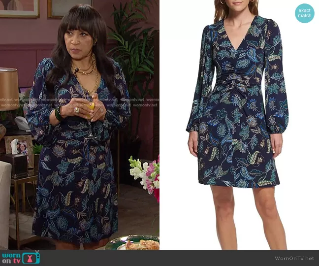 Paulina Price (played by Jackée Harry) on Days of our Lives on Peacock was spotted wearing this blue paisley print dress on Days of our Lives on Mar 22 2024's episode. Paulina's Dress is the Printed Short Mini Dress by Vince Camuto.