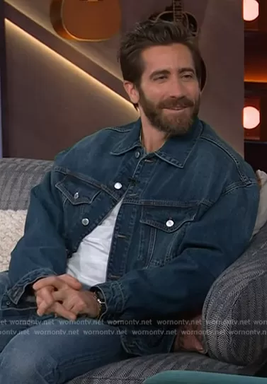 Prada Stone wash denim jacket worn by Jake Gyllenhaal on The Kelly Clarkson Show
