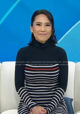 Vicky Nguyen on Today on NBC was spotted wearing this black striped sweater dress on Today on Mar 21 2024's episode. Vicky's Dress is the Kate Stripe Turtleneck Mini Dress by Rag & Bone.