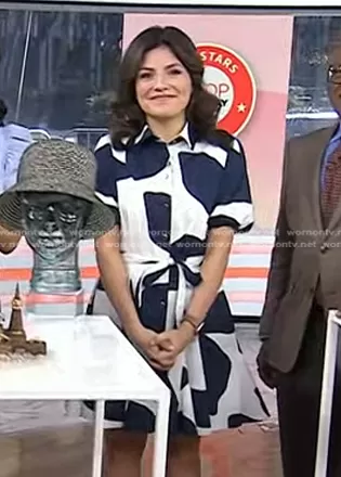 Adrianna Barrionuevo Brach on Today on NBC was spotted wearing this navy and white print shirtdress on Today on Mar 21 2024's episode. Adrianna's Dress is the Grand Foliage Godet Poplin Mini Shirtdress by Milly.